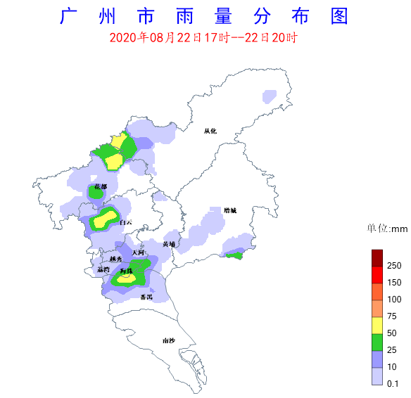 2020年8月22日17時至20時,廣州的偏西部地區(qū)出現(xiàn)了中到大雨局部暴雨,并伴有6-8級瞬時大風。共有23個站點錄得25-50毫米降水,12個站點錄得50-100毫米降水,全市平均面雨量為5.7毫米。最大降雨量為83.8毫米,最大小時雨量為81.3毫米,均出現(xiàn)在番禺區(qū)洛浦街。全市53個站點出現(xiàn)了6-7級大風,3個站點出現(xiàn)8-9級大風,其中白云區(qū)均禾街錄得最大陣風19.2米/秒(8級)。