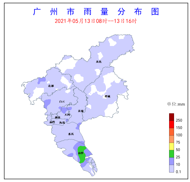 受低層偏南氣流影響,5月13日8時(shí)至13日16時(shí)南沙區(qū)出現(xiàn)了中到大雨,局部暴雨,其余各區(qū)大部出現(xiàn)了小到中雨,局部伴有6-9級(jí)陣風(fēng)和強(qiáng)雷電。全市共有2個(gè)測(cè)站(占比0.55%)雨量超過50毫米,9個(gè)測(cè)站(占比2.49%)雨量超過25毫米,南沙區(qū)珠江街錄得全市最大累積雨量63.7毫米,同時(shí)該站錄得全市最大小時(shí)雨量33.3毫米。另外,全市共有20個(gè)測(cè)站(占比5.52%)錄得6級(jí)以上陣風(fēng),花都區(qū)花東鎮(zhèn)花都區(qū)花東鎮(zhèn)錄得全市最大陣風(fēng)23m/s(9級(jí))。