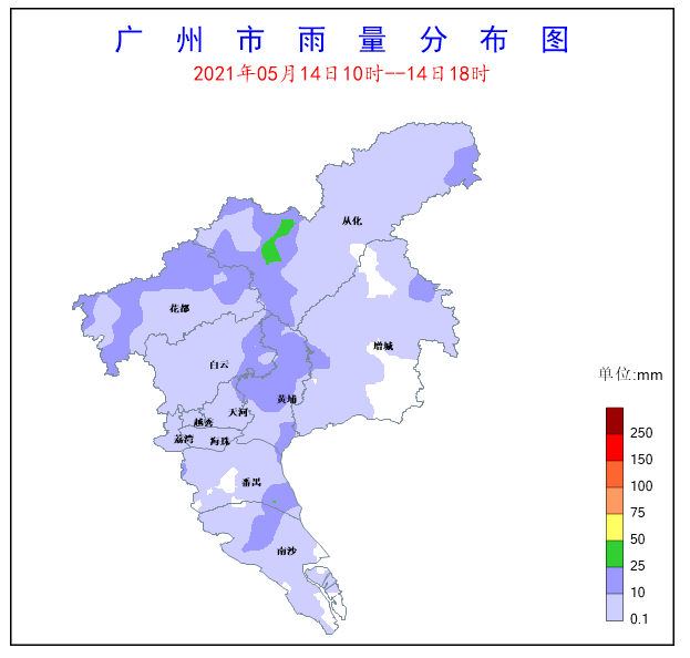 受低層偏南氣流影響,5月14日10時(shí)至14日18時(shí)從化區(qū)和番禺區(qū)出現(xiàn)小到中雨,局部出現(xiàn)了大雨,其余各區(qū)大部出現(xiàn)了小到中雨,局部有6-9級(jí)陣風(fēng)和強(qiáng)雷電。全市共有4個(gè)測(cè)站(占比1.1%)雨量超過25毫米。番禺區(qū)石樓鎮(zhèn)錄得全市最大累積雨量33.3mm,同時(shí)該站錄得全市最大小時(shí)雨量23.6mm。另外,全市共有50個(gè)測(cè)站(占比13.81%)錄得6級(jí)以上陣風(fēng),黃埔區(qū)長(zhǎng)洲街錄得全市最大陣風(fēng)20.9m/s(9級(jí))。