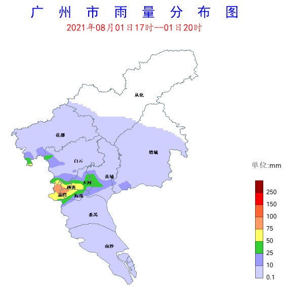 受低壓槽和西南氣流影響,2021年8月1日17-20時(shí),我市越秀、天河、荔灣、海珠區(qū)出現(xiàn)強(qiáng)雷雨局部暴雨,白云、黃埔、番禺、南沙、花都區(qū)出現(xiàn)分散雷陣雨局部暴雨,增城、從化區(qū)出現(xiàn)分散雷陣雨。期間,共有171個(gè)測(cè)站(47.2%)出現(xiàn)降雨,全市平均雨量9.5毫米,海珠區(qū)南華西街錄得最大累積雨量103.9毫米,30個(gè)測(cè)站(8.3%)雨量在50-100毫米之間;共有22個(gè)測(cè)站1小時(shí)雨強(qiáng)超50毫米,天河區(qū)獵德街海心沙島錄得最大小時(shí)雨強(qiáng)83.3毫米。
