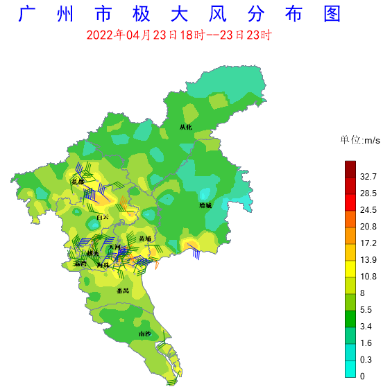 4月23日18時至23時,受弱低槽、中層小波動影響,廣州市中西部地區(qū)出現(xiàn)了一次暴雨局地大暴雨過程。全市平均雨量34.97毫米,16個測站(4.18%)雨量在100~250毫米之間,111個測站(28.98%)雨量在50~100毫米之間,37個測站(9.66%)雨量在25~50毫米之間。各區(qū)平均雨量(單位:毫米):越秀區(qū)52.4mm,天河區(qū)73.9mm,荔灣區(qū)34.9mm,海珠區(qū)32.3mm,白云區(qū)84.4mm,黃埔區(qū)79.4mm,番禺區(qū)24.3mm,南沙區(qū)0.2mm,花都區(qū)53.3mm,增城區(qū)16.4mm,從化區(qū)5.8mm。其中白云區(qū)太和鎮(zhèn)錄得最大累積雨量150.9毫米,白云區(qū)太和鎮(zhèn)錄得最大小時雨強(qiáng)94.5毫米。全市共6個測站錄得8~10級陣風(fēng),49個測站錄得6~8級陣風(fēng)。本次暴雨過程具有