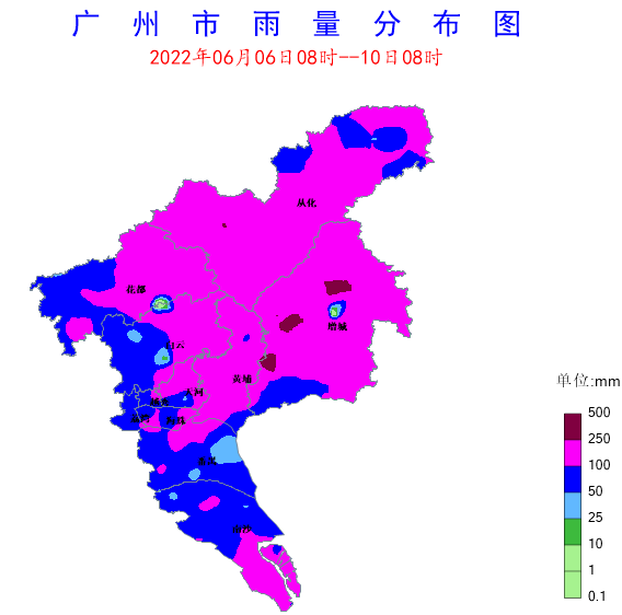 圖1 6日08時(shí)至10日08時(shí)廣州市雨量分布圖
