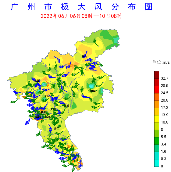 圖2 6日08時(shí)至10日08時(shí)廣州市極大風(fēng)分布圖