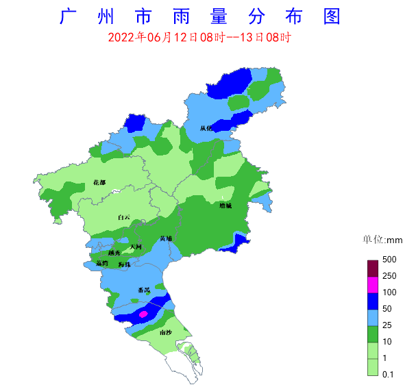 6月12日08時(shí)至13日08時(shí),受低渦切變和西南氣流共同影響,我市普遍出現(xiàn)大到暴雨局部大暴雨降水過程。全市共有373個(gè)測站(92.3%)出現(xiàn)降雨,全市平均雨量20.5毫米,3個(gè)測站(0.7%)雨量在100~250毫米之間,20個(gè)測站(5%)雨量在50~100毫米之間,105個(gè)測站(26%)雨量在25~50毫米之間。各區(qū)平均雨量(單位:毫米):番禺區(qū)35.8,荔灣區(qū)32,越秀區(qū)26,從化區(qū)24.3,海珠區(qū)23.6,黃埔區(qū)22.5,天河區(qū)21.8,南沙區(qū)20.6,增城區(qū)17.1,白云區(qū)10.2,花都區(qū)7.8。其中南沙區(qū)欖核鎮(zhèn)錄得最大累積雨量114.6毫米,南沙區(qū)東涌鎮(zhèn)得最大小時(shí)雨強(qiáng)95.7毫米。過程伴有強(qiáng)雷電和短時(shí)大風(fēng),全市共20個(gè)測站(5%)錄得8~10級(jí)陣風(fēng),109個(gè)測站(27%)錄得6~8級(jí)陣風(fēng),天河區(qū)前進(jìn)街錄得全市最大陣風(fēng)23.5米/秒。